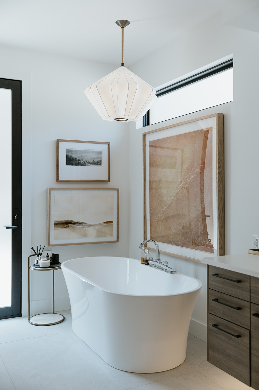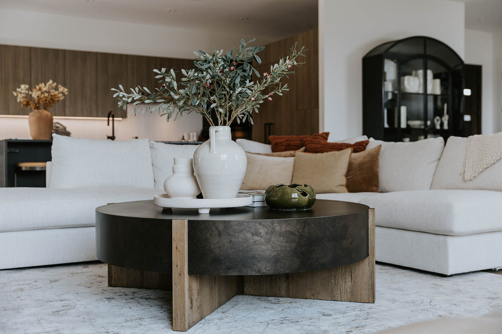 This “California Farmhouse” inspired home amalgamates new and sleek, with rustic charm. Textures, organic layers, and moody tones connect the interior to the exterior landscape. Styling pieces and furnishings create a harmonious blend to complete the space.
