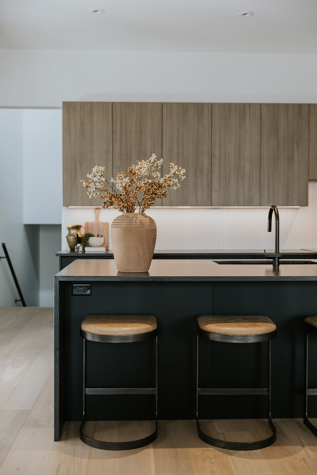 A sleek, modern kitchen and wine bar project that perfectly balances bold contrasts and natural warmth, creating a luxurious yet welcoming space for entertaining.